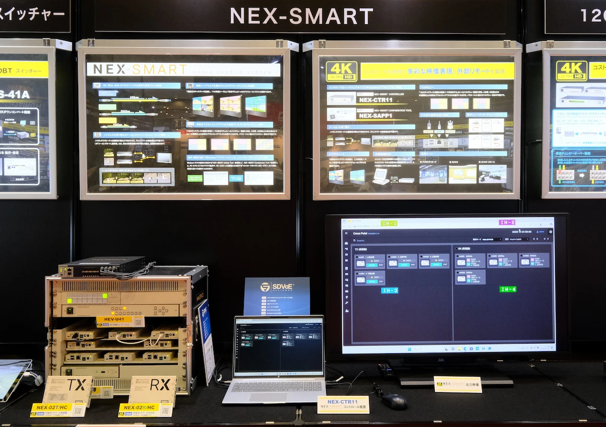 USBの伝送も可能なNEX-02の送受信デバイスを展示、小型ファンレスになり音楽ホールや催事場でもより導入し易くなり