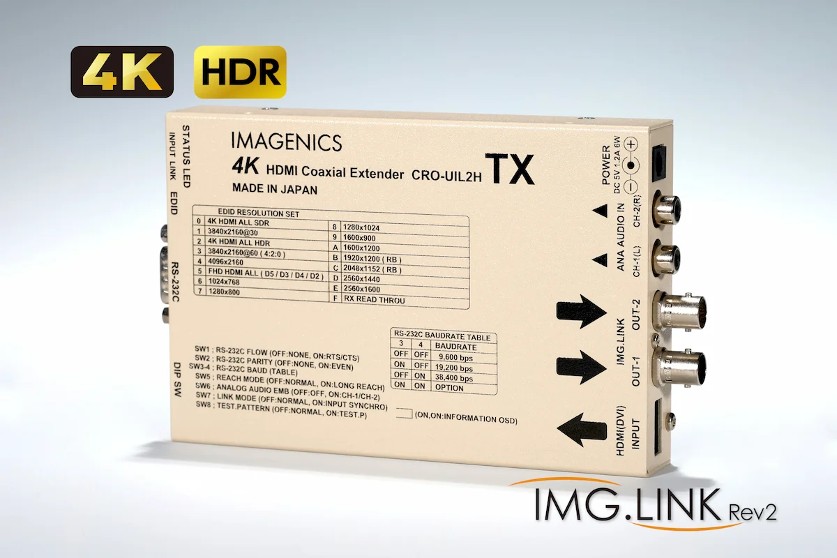 CRO-UIL2HTXは、IMG.LINK信号伝送器のHDMI送信器です。IMG.LINK Rev2規格に対応しており、HDMI 2.0 / HDCP 2.2 の4K@60の444カラー映像伝送に対応します。 IMG.LINK Rev2規格の受信器との組み合わせにより、HDMI 2.0規格の映像音声信号を同軸ケーブル1本で長尺伝送が可能です。伝送距離はHDMI信号の解像度等には依存しません。 RS-232C信号の双方向通信やアナログステレオ音声のエンベデットにも対応しています。