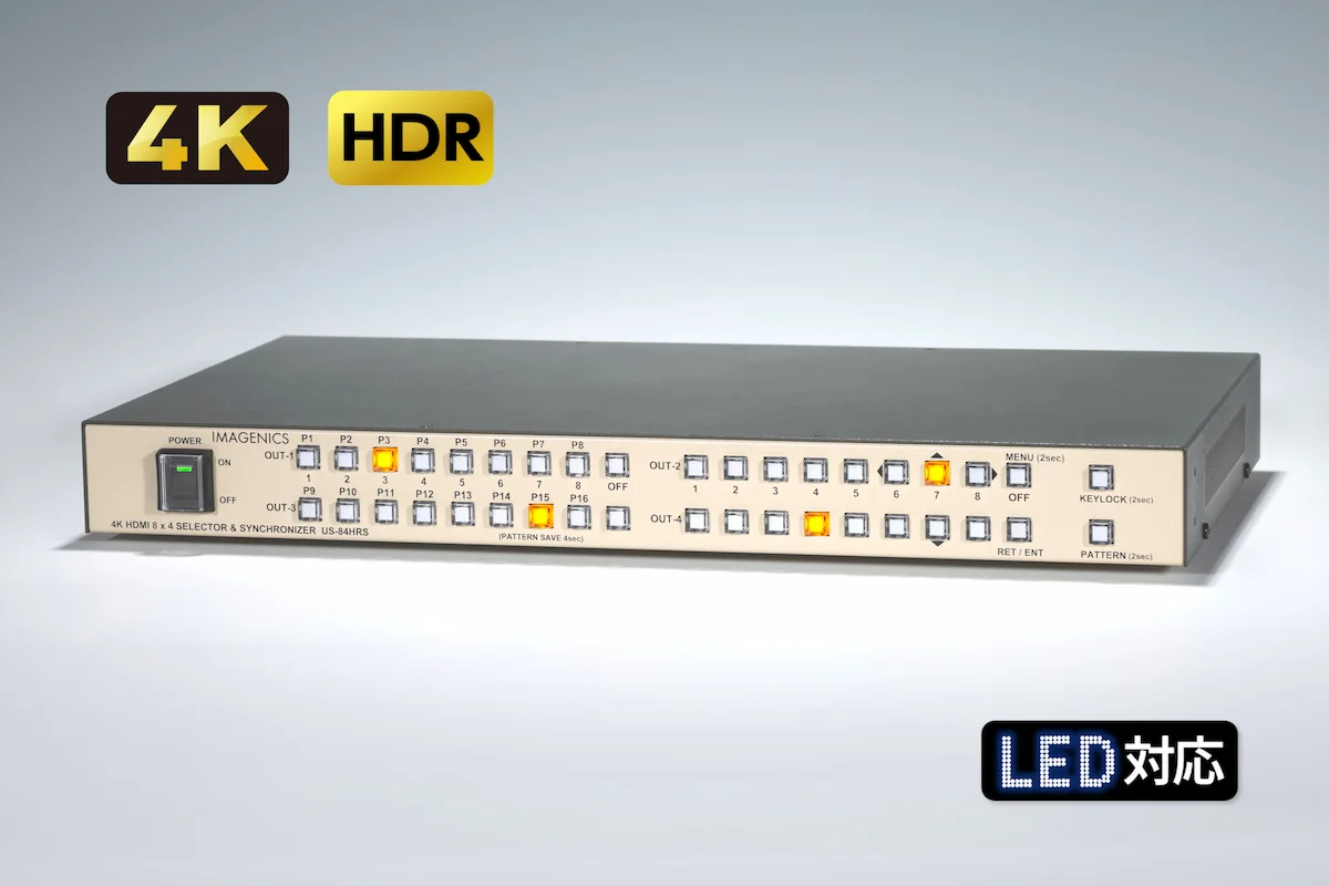US-84HRSは、HDMI 2.0/1.4およびHDCP 2.2/1.4規格に準拠したHDMI信号の8x4マトリクス型セレクターです。 全出力に個別のフレームシンクロナイザー機能を装備しており、出力解像度は4K@59.94ほか主要な解像度へ統一しての高速疑似シームレス繋ぎ出力が可能です。 バリアブルズーム拡大縮小機能やマルチ画面構成用の任意位置切出し拡大、90度単位の画面回転、パターンメモリー機能を利用して一括した画面構成切替が可能です。