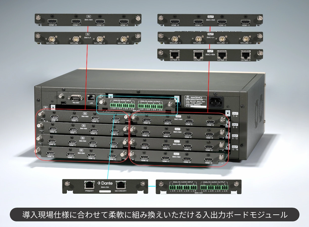 BMS-1616は、4K60p444 HDMI信号に対応した16入力16出力のマトリクススイッチャーです。 入出力ボードは4K HDMI、IMG.LINK Rev2、HDBaseTの組み換え、音声はアナログ信号とDanteオーディオに対応、 本体のみでの映像音声の任意時間シーケンシャルや信号検知による自動切替、動作履歴や信号入出力イベントを記録するログ取得が可能です。