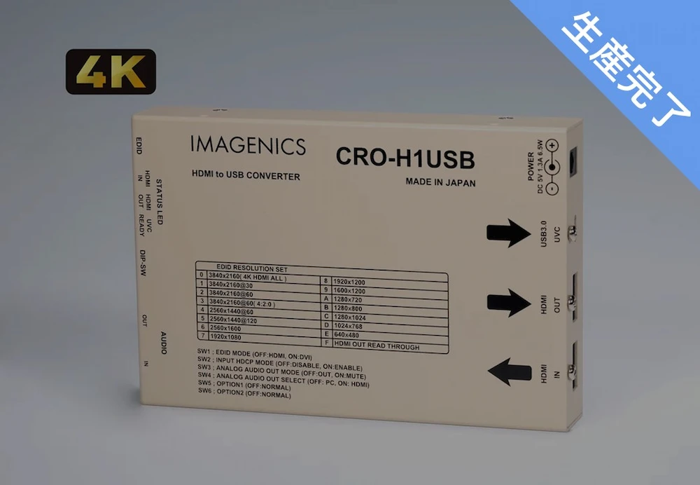 CRO-H1USB は 4K60/4:4:4 の HDMI 信号に対応した EDID エミュレート機能およびケーブル補償機能付きの HDMI–USB 変換機です。
