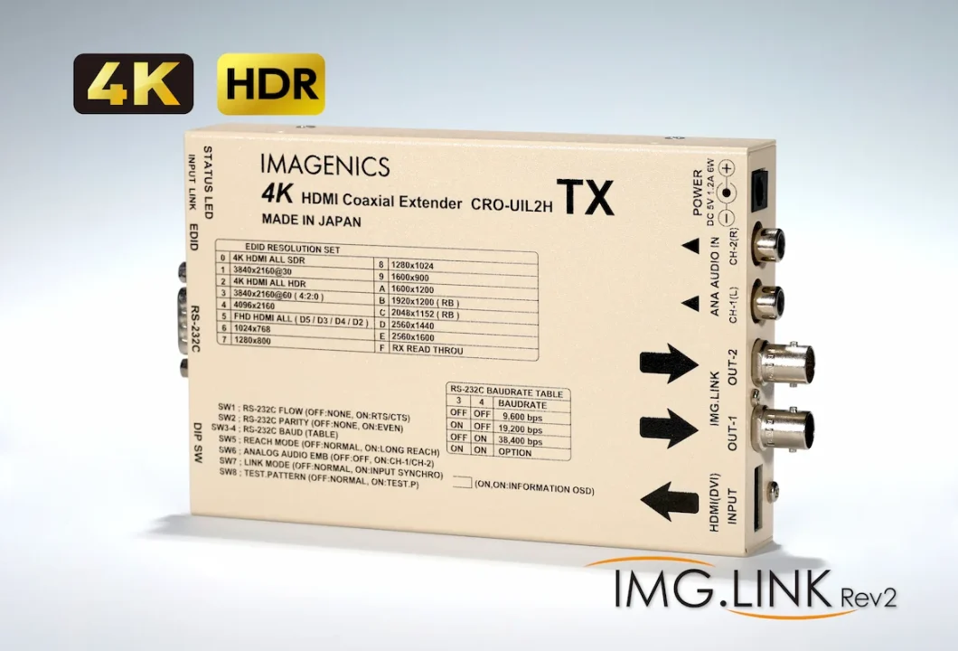CRO-UIL2HTXは、IMG.LINK信号伝送器のHDMI送信器です。IMG.LINK Rev2規格に対応しており、HDMI 2.0 / HDCP 2.2 の4K@60の444カラー映像伝送に対応します。