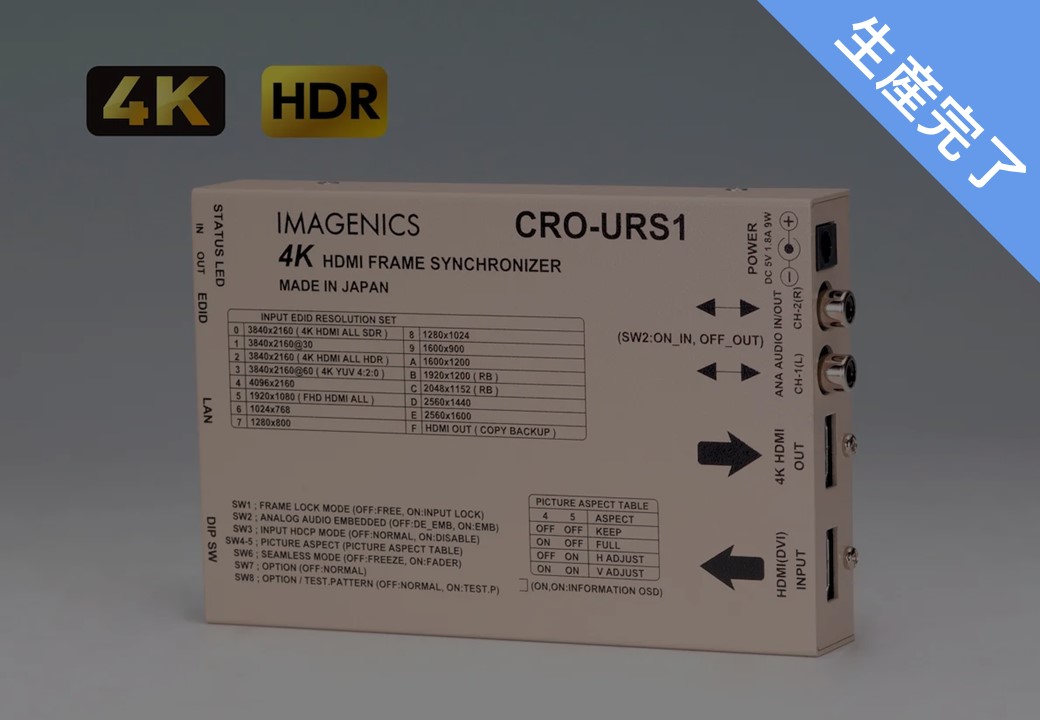 CRO-URS1は、HDMI 2.0/1.4およびHDCP 2.2/1.4規格に準拠したフレームシンクロナイザーです。各種4K HDR映像やHDCP規格に対応し、