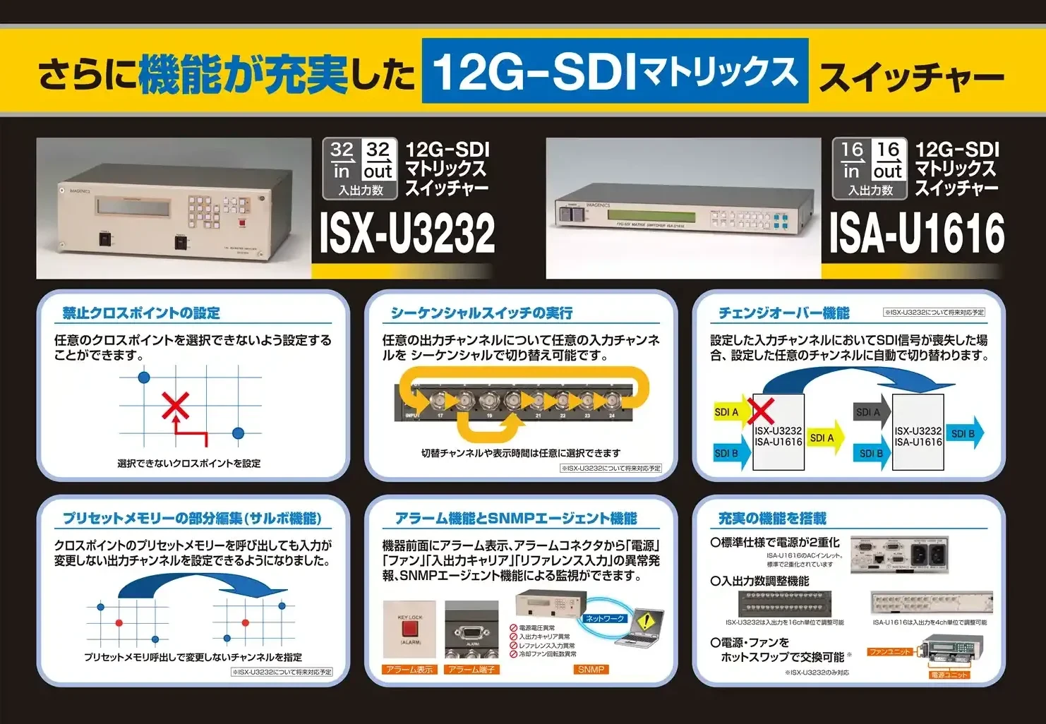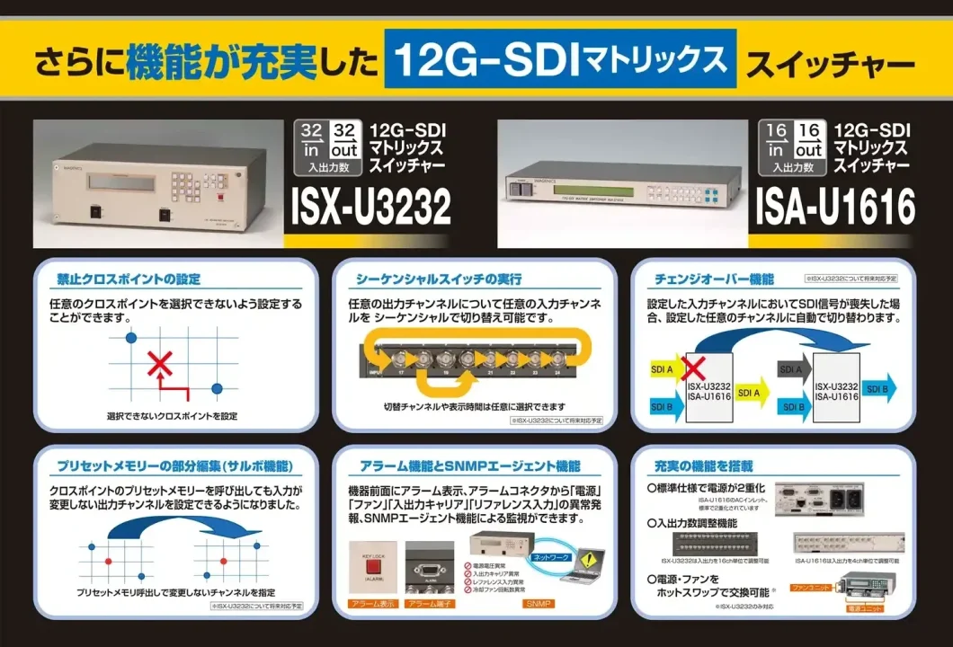 ISA-U1616は、12G-SDI、6G-SDI、3G-SDI、HD-SDI、SD-SDI、DVB-ASIなどの多規格に対応した、最大16入力16出力マトリックススイッチャーです。
